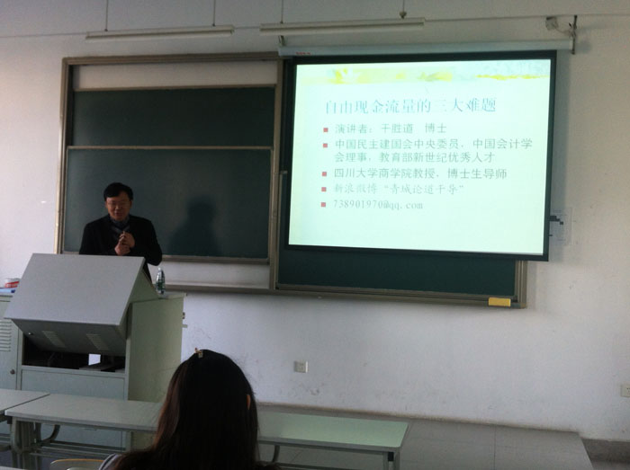 2014年11月13日下午,四川大学商学院博士导师、国内著名的财务学者干胜道教授,应聚彩堂 邀请,对聚彩堂 广大师生作了“自由现金流量的三大难题”学术讲座。自由现金流量是现代公司治理中的重要概念,是理解和解决代理问题的一把锁匙。干教授首先从人们日常生活入手,逐步引入对自由家庭自由现金流量、企业自由现金流量的理解,同时,大量引入中国上市公司案例,分析自由现金流量产生的原因、背景、形式及由此导致的中国式公司治理问题。最后针对自由现金流量的“定量难”、“代理成本区分难”和“约束难”等三大难问题,干教授提出了自主的见解主张。同时,结合本课题的研究,干教授还与我们分享了国家基金申报的选题、论证、团队构建等方面经验。