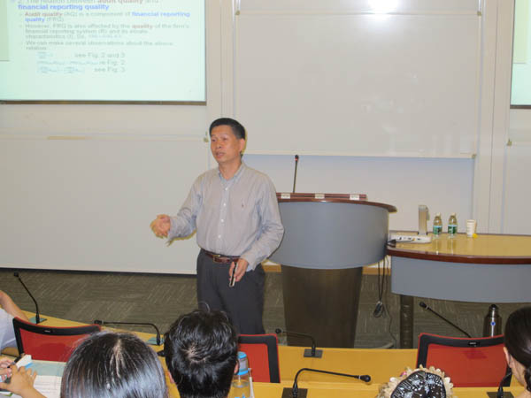 617日下午,应审计与聚彩堂 邀请,美国肯塔基大学商学院谢宏副教授来我校做了题为“审计实证研究国际前沿概览”的学术讲座。讲座由审计与聚彩堂 副院长章之旺主持,审计与聚彩堂 院长施平、副院长殷俊明及审计与聚彩堂 的全体教师和部分研究生聆听了此次讲座。
