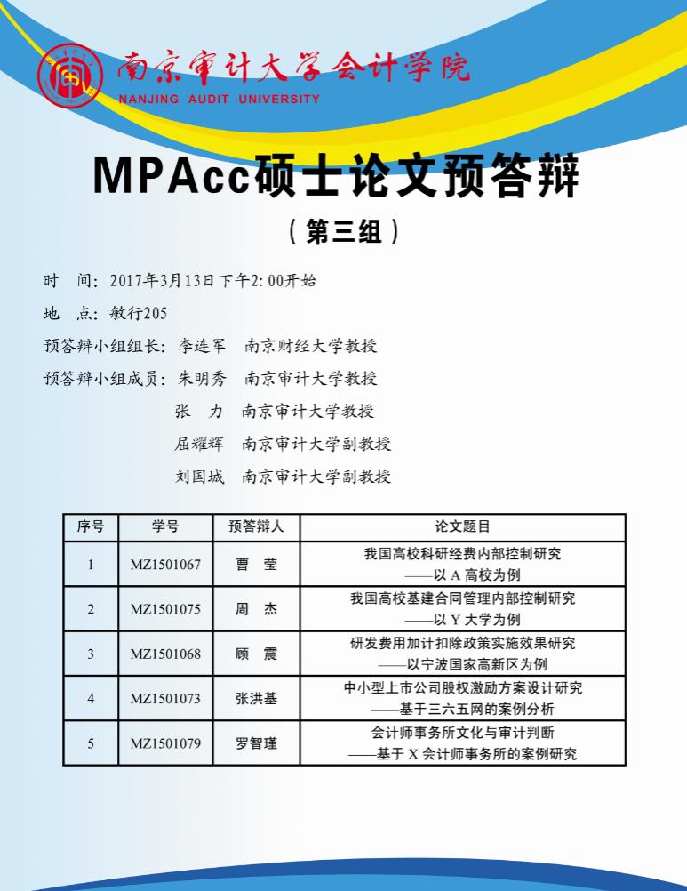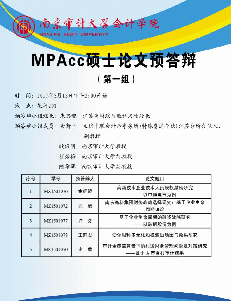根据研究生院《关于做好2015级专业学位硕士研究生培养和学位论文工作的通知》和《南京审计大学硕士研究生学位论文答辩与学位申请管理办法》(南审研发〔2016〕15号)的有关要求,特制定2015级MPACC硕士研究生学位论文预答辩工作方案。