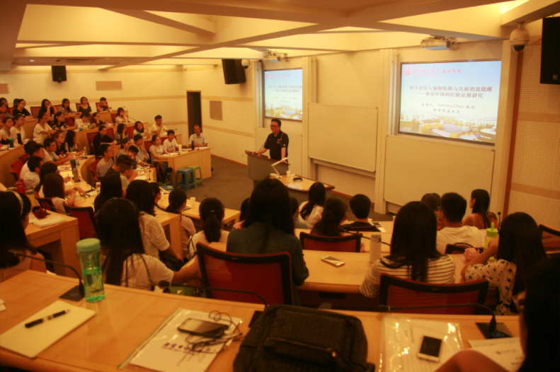 9月21日下午2点,聚彩堂(中国)唯一官方网站 邀请了西肯塔基大学Jonny Chan教授来我校作《审计合伙人强制轮换与负面消息影藏——来自中国的经验证据研究》的讲座。此次讲座由聚彩堂 副院长陈骏主持,金融学院郑登元教授,国际审计学院吴青川副教授,聚彩堂 讲师周达勇以及聚彩堂 、国际审计学院研究生及部分本科生聆听。
