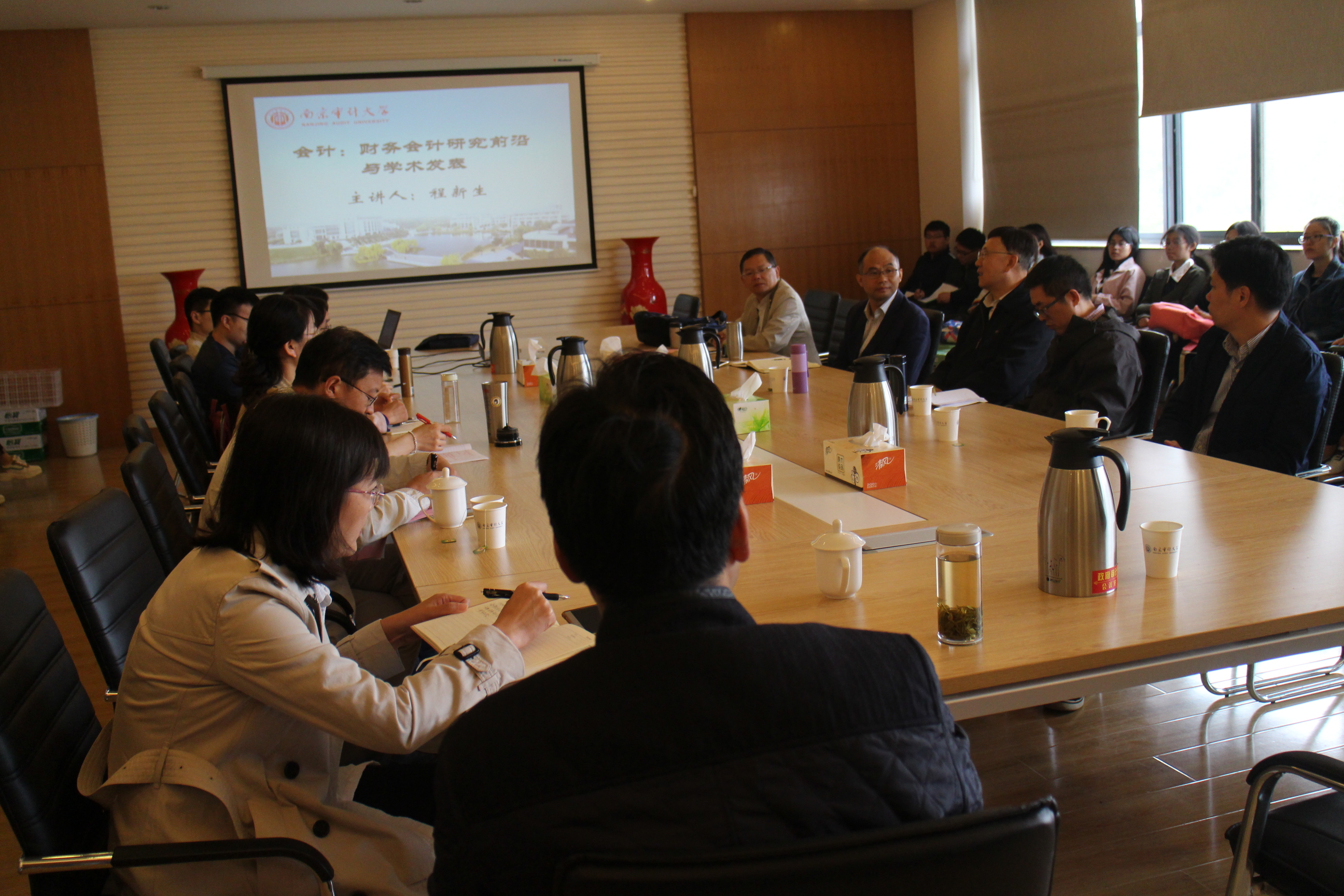 讲座期间,程新生教授用轻松幽默的话语营造了一个愉悦的氛围。他先是通过讲述自己写文章的经历告诉大家怎样才能创作出优秀的学术成果,着重强调了论文选题的重要性,紧接着对论文研究方法提出自己的见解,然后根据自己在《南开管理评论》做主编的经验,将期刊的用稿规则与特点、审稿流程与阶段为我们做了生动、详尽的介绍,提出了自己独到的见解,鼓励我们深入研究,并且为我们指出了许多比较有发展空间的研究方向。最后,程教授与在场的各位老师进行了深入交流与探讨,在企业内部控制、创新活跃度、技术董事权威和审稿规范及用稿规则等方面为老师们答疑解惑,提出了许多实用的建议,并对南京审计大学的老师和同学们寄予了殷切的期望。