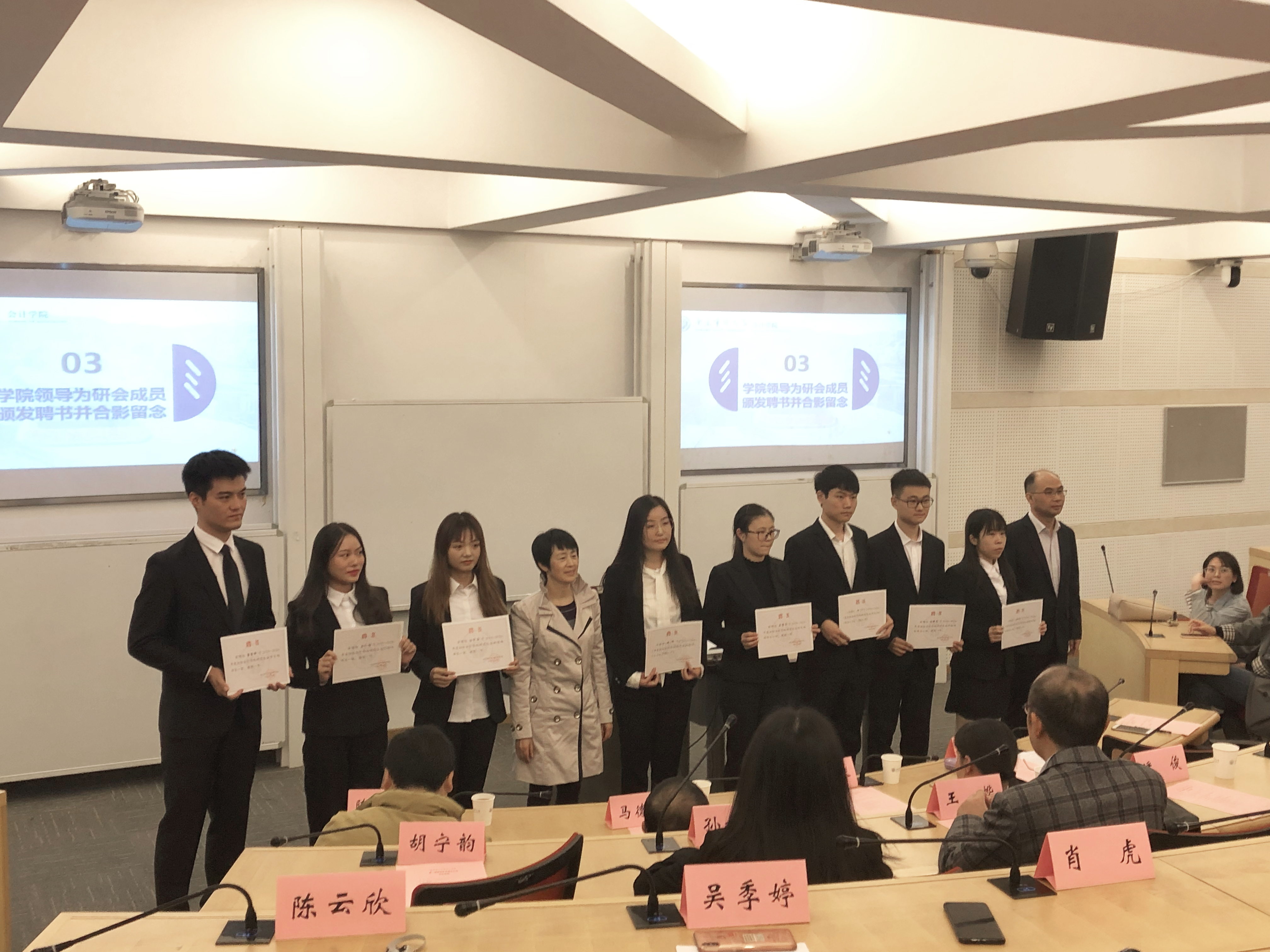 会议伊始,马德林副院长介绍了聚彩堂 研究生成立背景、意义,简单介绍了研究生会干部招聘流程,并宣读了《关于成立聚彩堂 研究生会的决定》。曹惠琴、朱惠媛、殷俊明等领导向聚彩堂 研究生会成员颁发聘书。