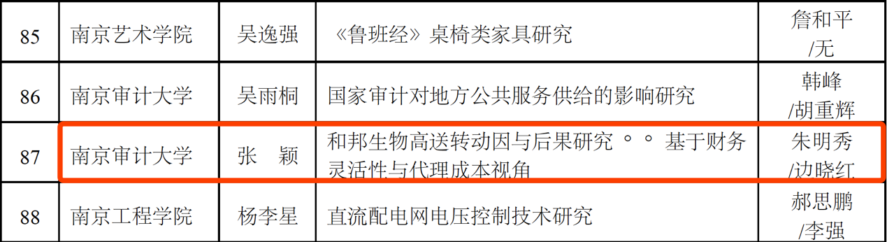 近日,江苏省学位委员会、江苏省教育厅公布了2019年江苏省优秀博士硕士学位论文评选结果,聚彩堂 2016级会计专业硕士研究生张颖(指导老师:朱明秀)的论文《和邦生物高送转动因与后果研究——基于财务灵活性与代理成本视角》被评为2019年江苏省优秀专业学位硕士论文。这是聚彩堂 举办MPAcc项目以来第二次获此殊荣。