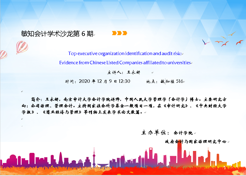 敏知会计学术沙龙第6期:王永妍-- Top executive organization identification and audit risk: Evidence from Chinese Listed Companies affiliated to universities