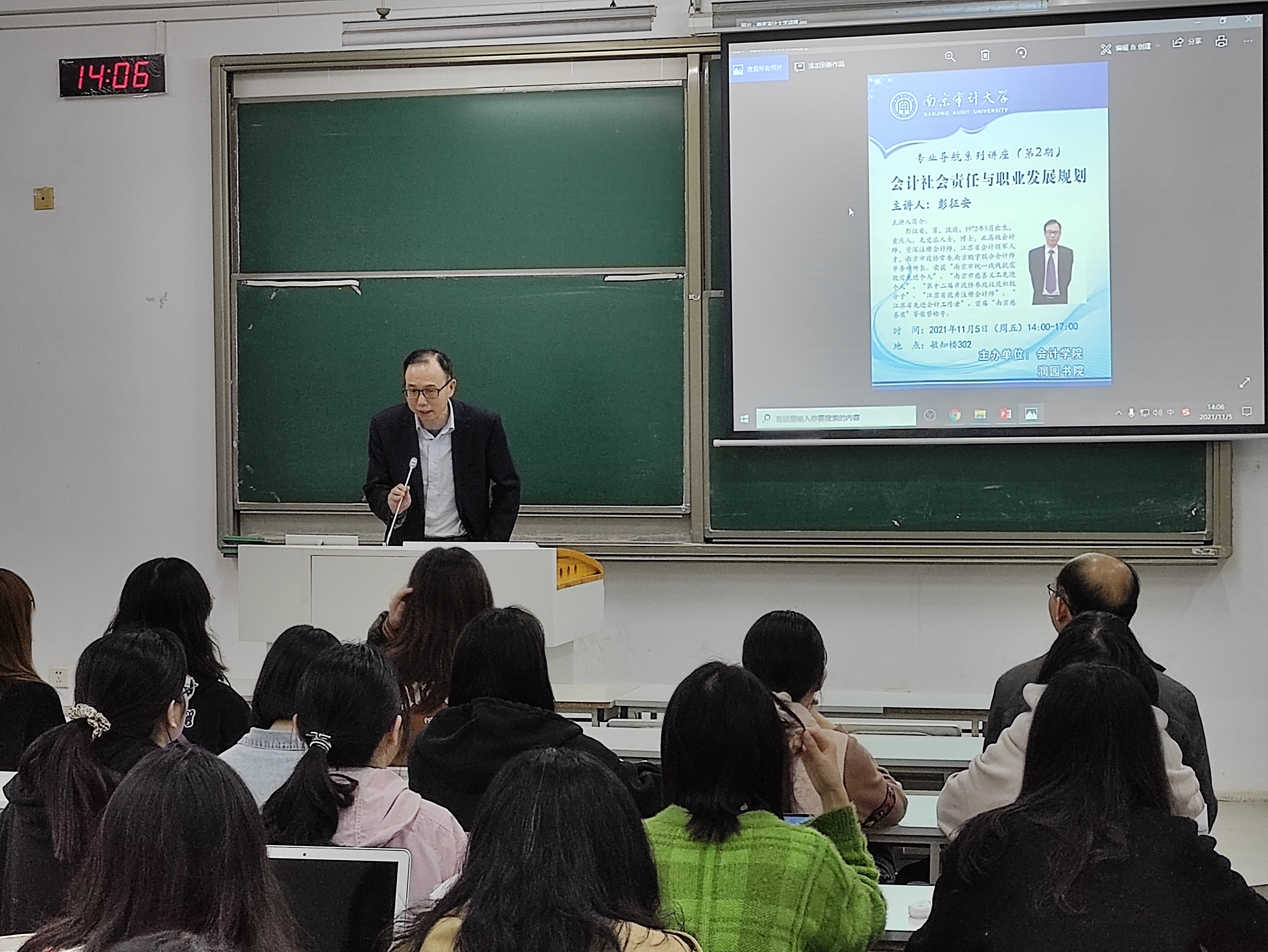 为全面贯彻落实习近平新时代中国特色社会主义思想,以培育和践行社会主义核心价值观为根本,以“两在两同”建新功行动为契机,深入推进学校组织开展的11 月“一心一意”志愿服务月活动,11月5日下午,聚彩堂 、润园书院和江苏省注册会计师行业发展研究院联合在敏知302举办第2期专业导航系列讲座。江苏省先进会计工作者、江苏省会计领军人才、南京市政协常委、市慈善义工先进个人、统一战线抗震救灾先进个人、正高级会计师、南京鹏宇联合会计师事务所所长彭征安应邀来我校作题为“会计社会责任与职业发展规划”的讲座,讲座由聚彩堂 党委书记殷俊明教授主持。