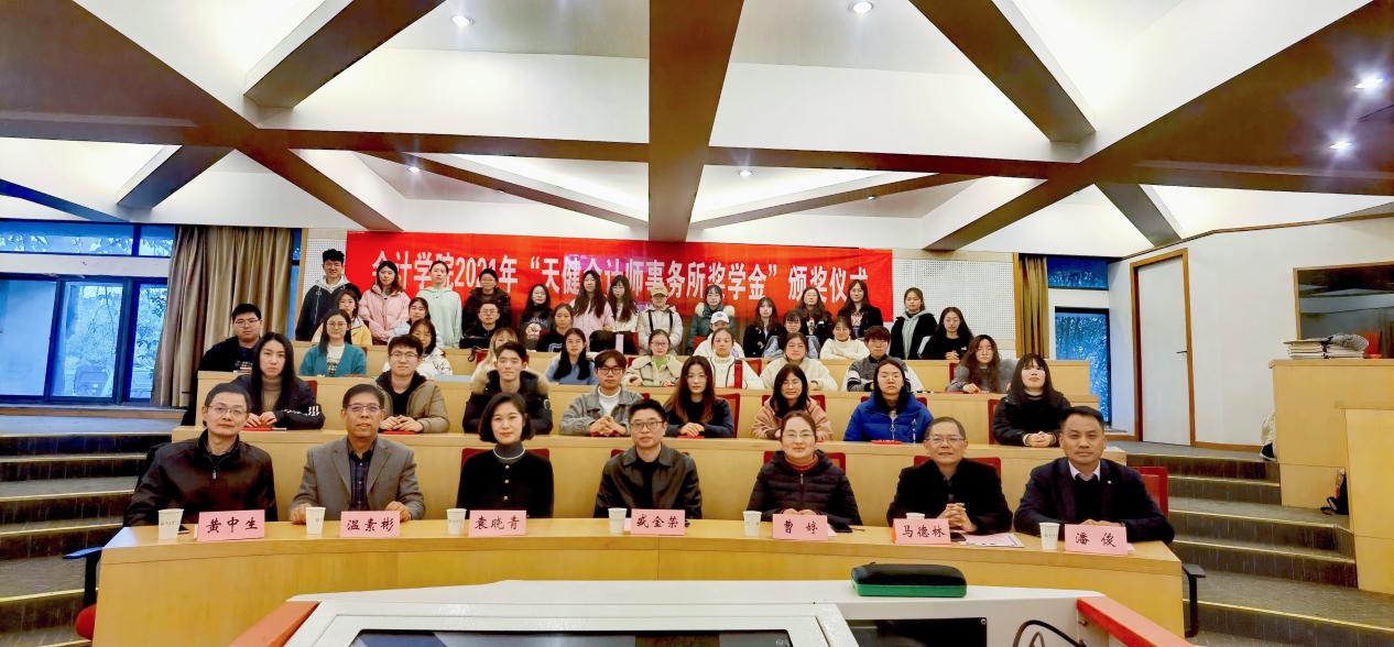 颁奖仪式上,与会嘉宾为天健励志奖学金获得者及一、二、三等奖学金获得者颁奖并合影留念。