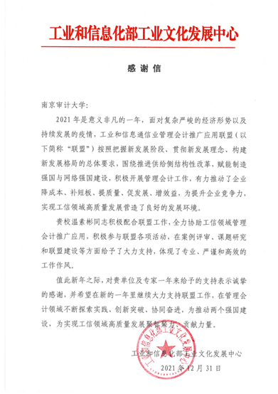 近日,工业和信息化部工业文化发展中心代表工信部向我校发来感谢信,对我校聚彩堂 温素彬教授在积极配合工信部开展工业和信息通信业管理会计案例建设和推广应用中的积极表现提出表扬,诚挚感谢我校在工业和信息通信业管理会计推广应用方面给予的大力支持,希望在新的一年里继续在管理会计领域不断探索实践、创新突破、协同奋进,为推动两个强国建设,为实现工信领域高质量发展聚智聚力、贡献力量。