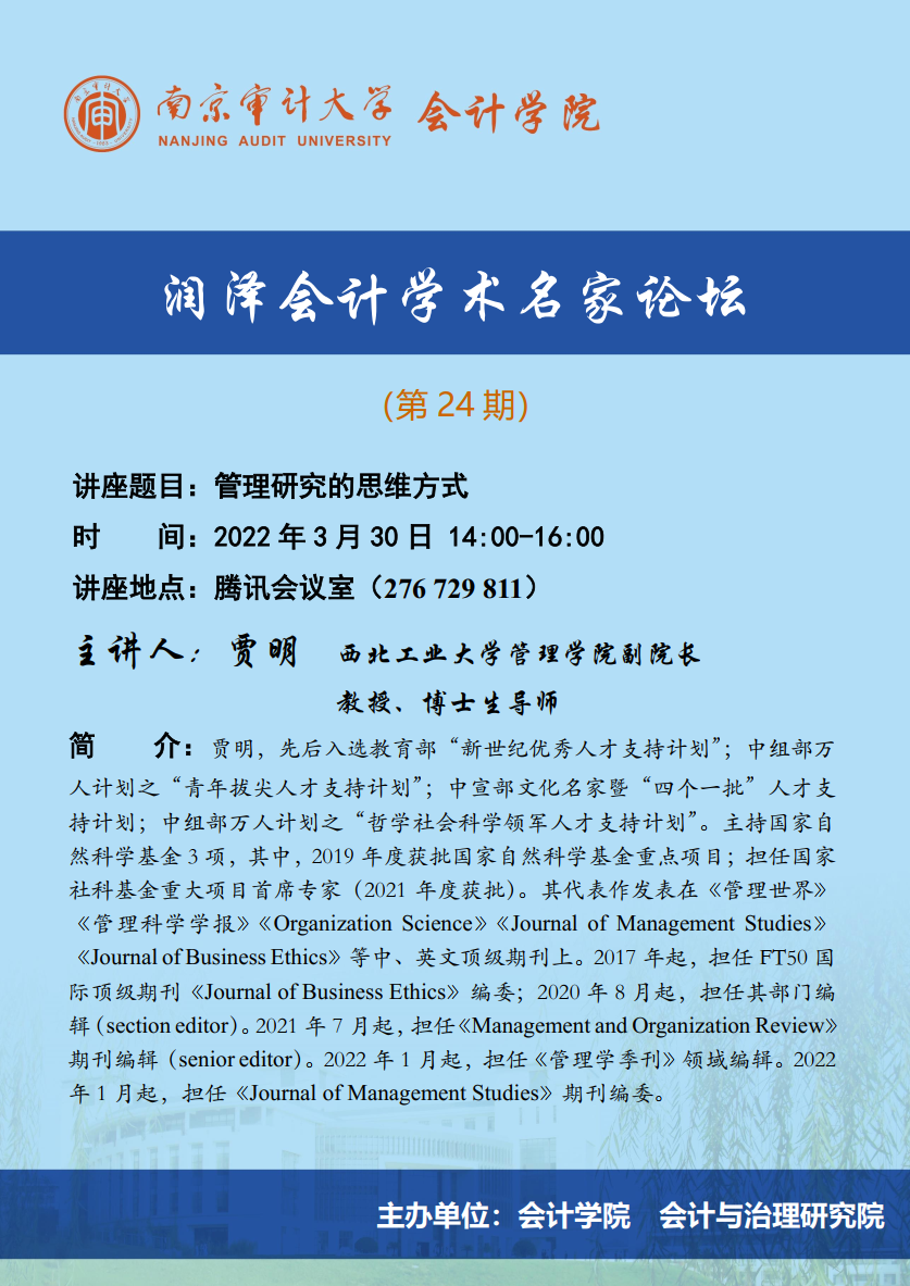 润泽会计学术名家论坛第24期:贾明-管理研究的思维方式