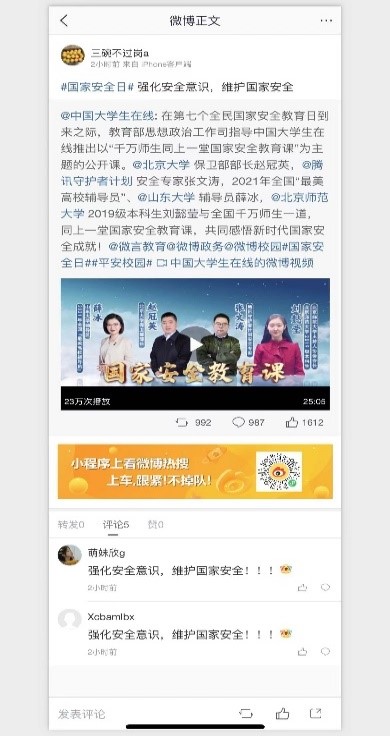 学生们积极在微博、微信、抖音等平台参与#国家安全日#话题互动,在这个过程中,不仅有效激发了学生参与到国家安全教育活动中的积极性和主动性,而且不断鼓励学生积极传播正能量。