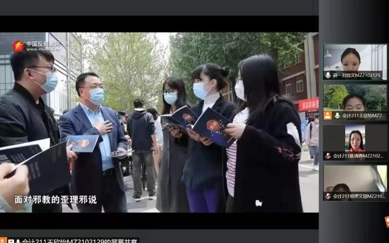 各班级以寝室为单位,寝室长采用线上与线下相结合方式组织各寝室成员共同学习“国开大讲堂·国家安全教育公开课”国防教育系列课程以及在线观看“反邪教警示教育进校园”专题宣传片。