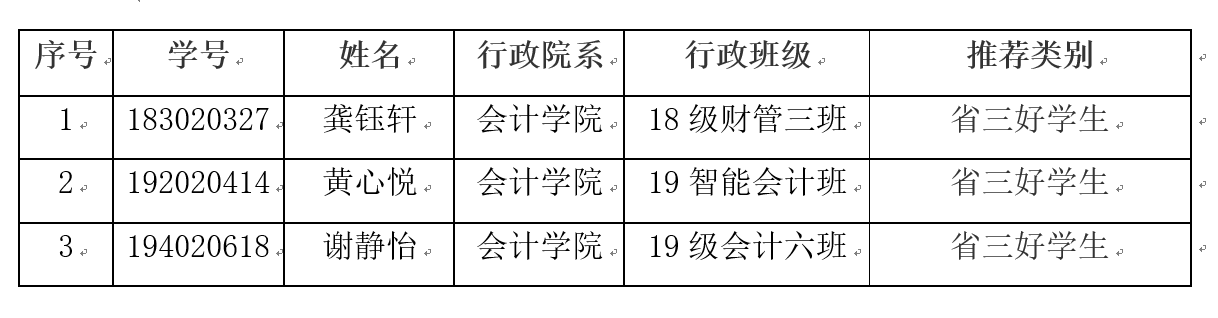根据学校《关于推选省级三好学生、优秀学生干部、优秀毕业生和先进班集体的通知》要求,经学生申报、学院审核讨论,拟推荐龚钰轩、黄心悦、谢静怡3位同学为2022年江苏省三好学生候选人,现予以公示。