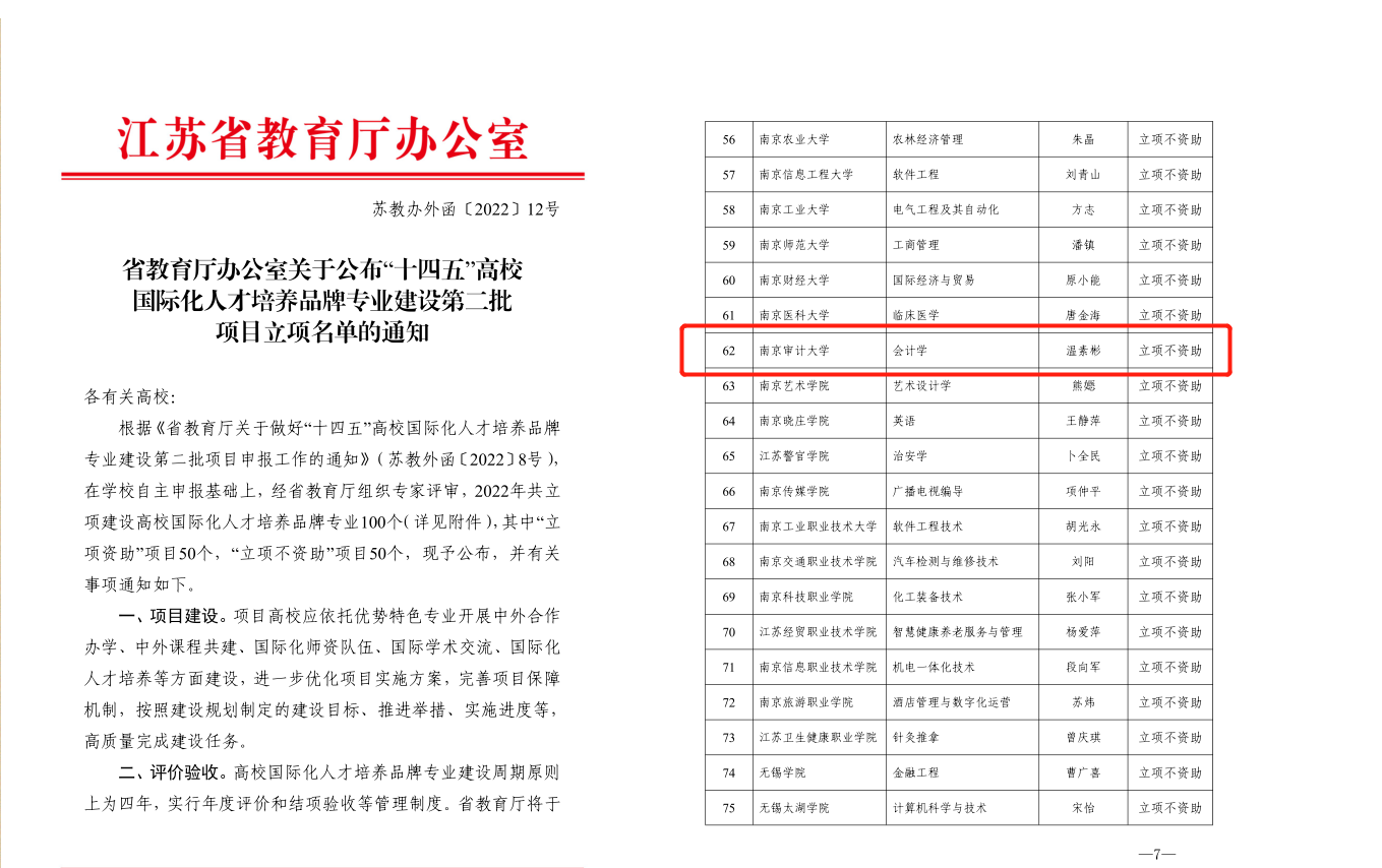 近日,江苏省教育厅公布了《“十四五”高校国际化人才培养品牌专业建设第二批项目立项名单》(苏教办外函〔2022〕12号),我校会计学本科专业成功入选。