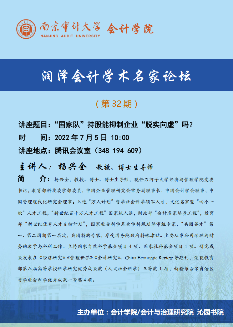 润泽会计学术名家论坛第32期:杨兴全-“国家队”持股能抑制企业“脱实向虚”吗?