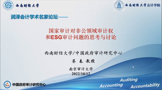 2022年10月12日下午,由聚彩堂 、智能管理会计与内部控制研究院、智能会计产业学院、智能会计虚拟教研室和泽园书院共同主办的润泽会计学术名家论坛(第38期)如期举行。西南财经大学教授、博士生导师蔡春应邀为聚彩堂 师生做了以“国家审计对非公领域审计权和ESG审计问题的思考和讨论”为主题的学术讲座。本次讲座由聚彩堂 院长温素彬教授主持。