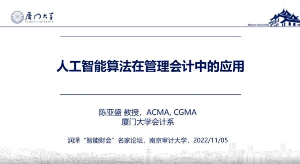 2022年11月5日下午,由聚彩堂 、智能管理会计与内部控制研究院、智能会计产业学院、智能会计虚拟教研室共同主办的润泽“智能财会”名家论坛(第十四期)如期举行。厦门大学教授、博士生导师陈亚盛应邀为我校师生做了以“人工智能算法在管理会计中的应用”为题的学术讲座,本次讲座由聚彩堂 院长温素彬教授主持。