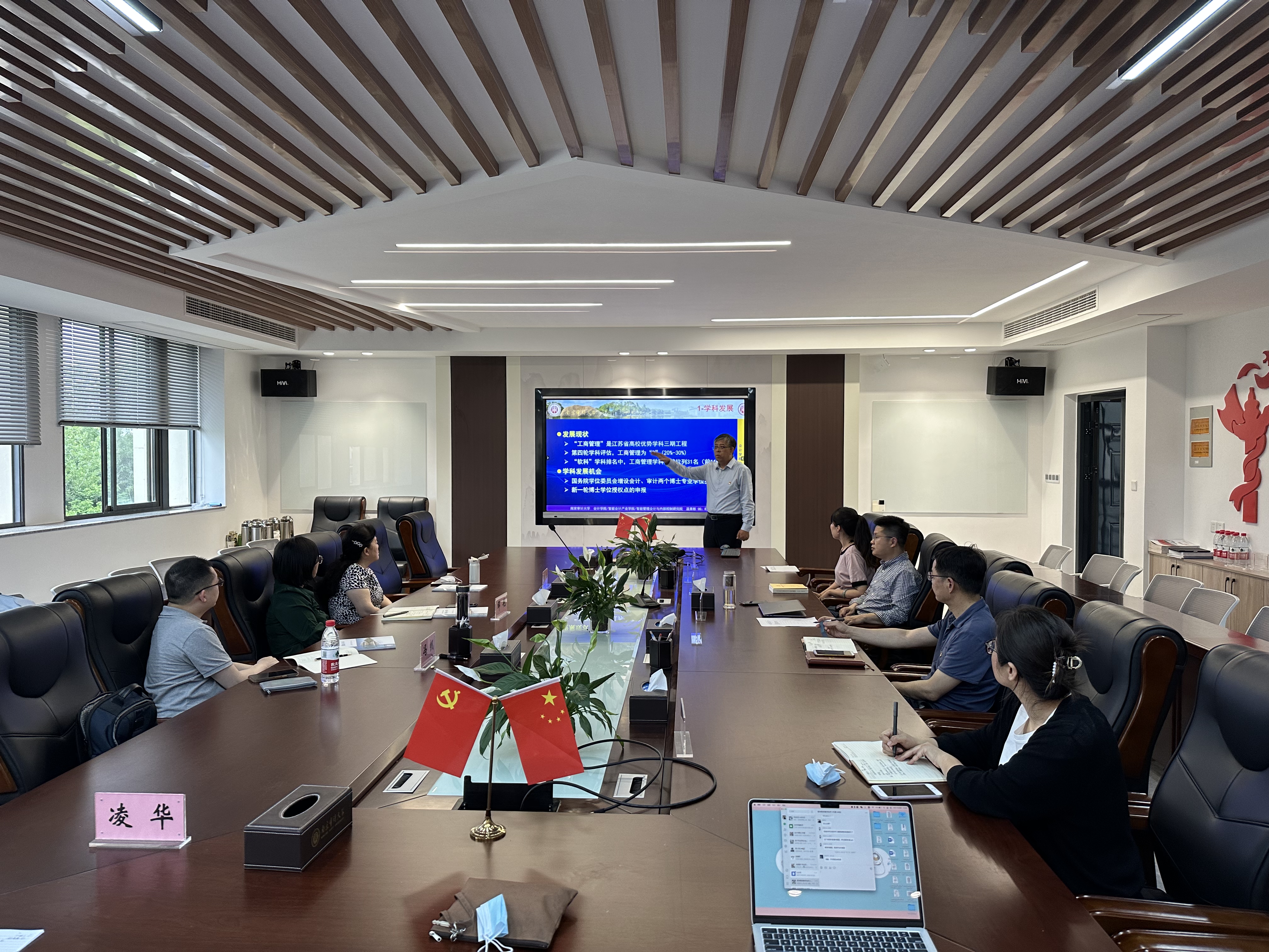 温素彬代表学院对周宁教授一行的来访表示热烈欢迎。温素彬向来宾介绍了南京审计大学的办学历史和发展变革,并从学院发展现状、学科发展、人才培养、青年教师培养、毕业生质量管理等六个方面做题为《聚彩堂 本科人才培养和学科概况》汇报,并重点介绍了聚彩堂 财会智能化人才培养改革、产教融合和课程思政建设经验。