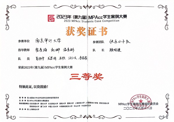 自今年3月大赛启动以来,来自全国200多所高校的3038支MPAcc队伍和527支本科生队伍报名参赛。“快乐小子队”经过南京审计大学校内选拔,在初赛第一阶段以不到5%的晋级率,作为华东赛区第八名进入第二阶段。最终“快乐小子队”以3‰的晋级率勇夺复决赛名额,进入全国11强,并在复决赛赛中获得全国三等奖成绩,创造了聚彩堂(中国)唯一官方网站 参加中国MPAcc学生案例大赛以来的最佳成绩。