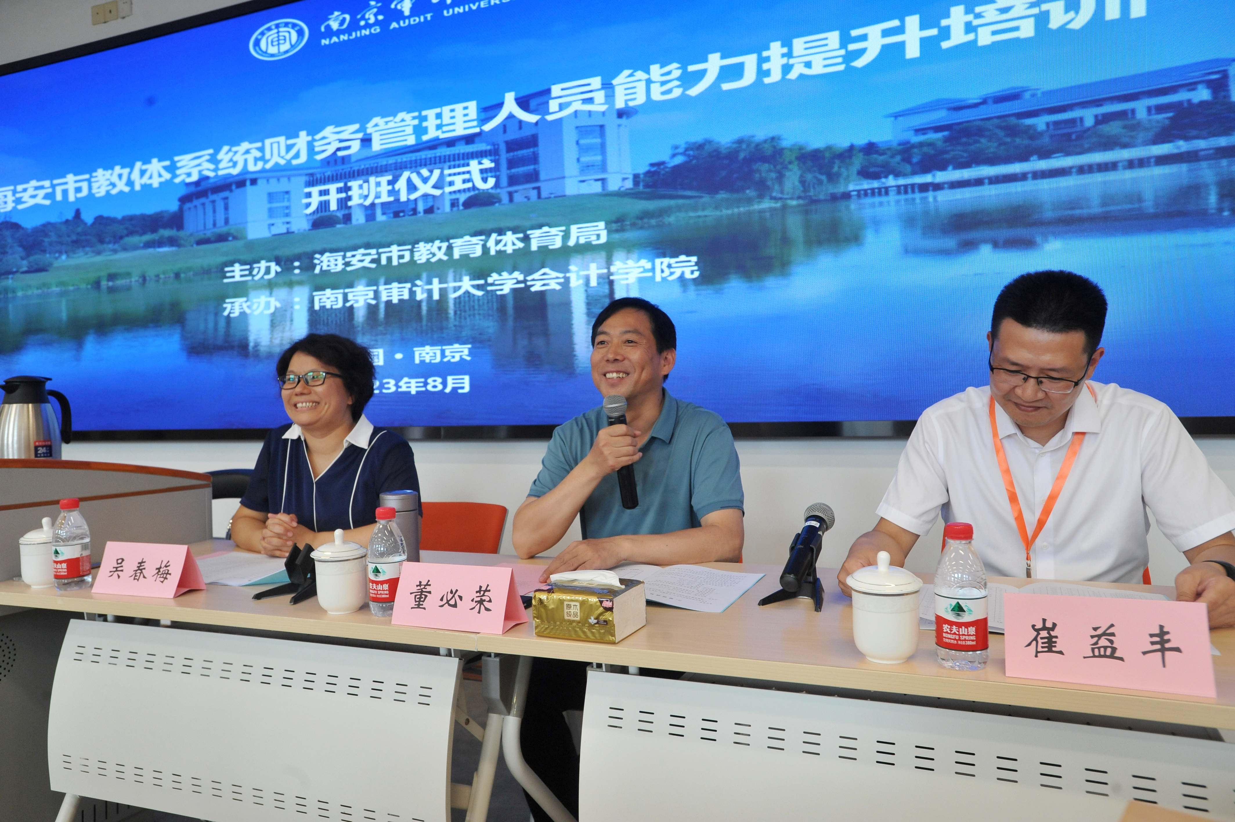 校党委副书记、校长董必荣参加开班仪式并致辞。董必荣对海安教体局的信任和支持表示感谢,他指出,在深入学习贯彻习近平总书记重要回信精神的过程中,审大人充满信心、干劲十足,正在奋力推进高水平一流大学建设,他向参训学员介绍了学校40年来的办学成果和基于审计特色的发展战略。董必荣结合新时代中小学财务管理的发展趋势,受邀做《中国式现代化与教育强国建设》主题教育党课。