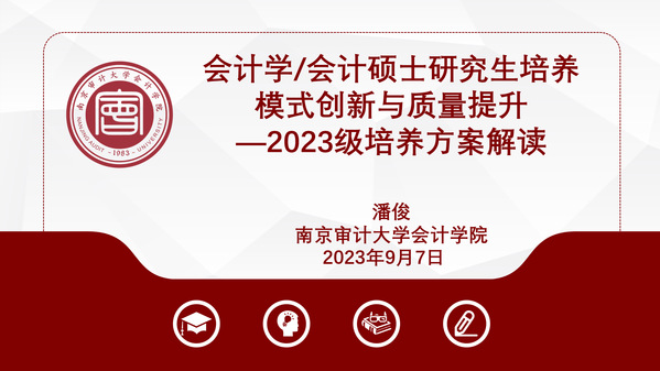 潘俊作“会计学/会计硕士研究生培养模式创新与质量提升——2023级培养方案解读”的讲座。首先详细介绍聚彩堂 的概况与发展历程,展示聚彩堂 人才培养成效,帮助同学们了解聚彩堂 ,鼓励同学们以师兄师姐为榜样,积极应对研究生期间的机遇与挑战。随后详细解读硕士研究生培养方案,指出研究生应具有的基本素养和专业能力,帮助同学们了解会计学和会计专业硕士的培养方式与学位申请条件。最后对同学们的研究生阶段学习给出了建议,提出了“成功=智商+情商+财商+研商”的理念,引导同学们培养学术兴趣,增强身为南审人的自信心,刻苦奋进,争取早日成为专业人才。