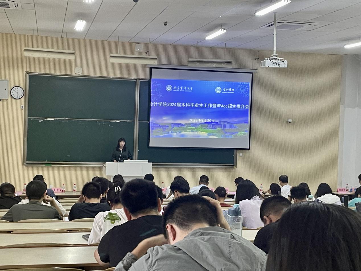 最后,潘俊作“守护国家经济安全 培养财会监督人才——审大MPAcc的‘关键事项披露’”的报告,从培养模式、师资力量、研究方向等方面详细介绍了MPAcc项目,引导同学们培养学术兴趣,增强学术素养。潘俊指出该项目中的四大研究方向——资本市场会计与财务、注册会计师审计与财会监督、政府会计与国家治理、大数据分析与智能管理会计,都是如今财会行业的研究热点,督促学生紧跟行业发展趋势,明确未来发展方向,提前做好规划并逐步落实行动。