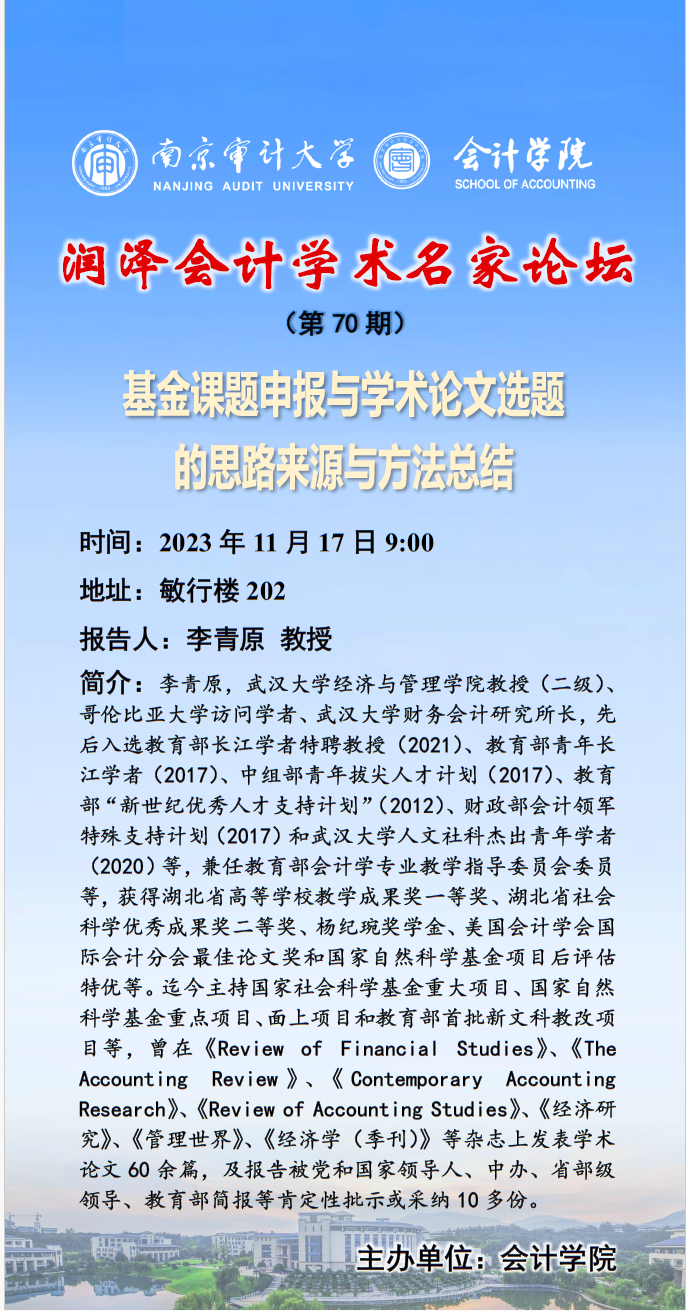 润泽会计学术名家论坛 (第 70 期):李青原——基金课题申报与学术论文选题的思路来源与方法总结