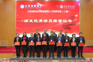 与会全体领导为优秀毕业生颁发荣誉证书,为期三年的江苏高校会计高端管理人才培养项目(二期)在温馨的氛围中圆满落下帷幕。