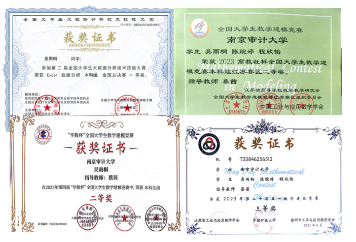 学习方面,学分绩点4.22,专业排名第一,综测等级A+,荣获国家奖学金、校综合一等奖学金、三好学生、先进个人等;志愿服务方面,吴雨桐积极投身于志愿服务,志愿时长超过140小时,连续三年被评为优秀志愿者;实践方面,积极参加国家级项目的调研活动,并在假期开展社会实践活动;竞赛方面,获全国大学生大数据分析技术技能大赛国家一等奖、全国大学生电子商务“创新、创意及创业”挑战赛国家二等奖、全国大学生数学建模竞赛省级二等奖等。