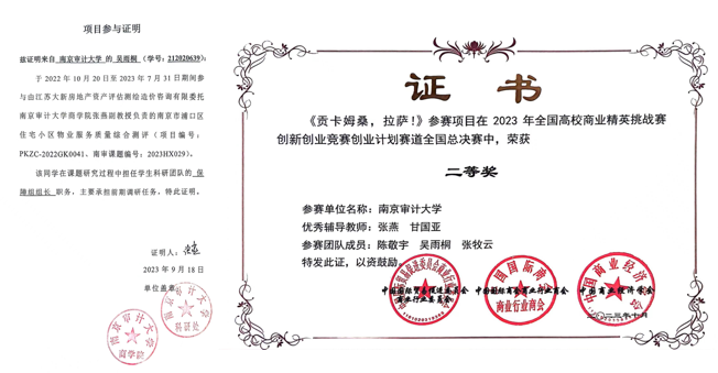 能力的提升应该是多方面的,大学期间参加的项目让吴雨桐学会了平衡学习和实践,并且要在社会调研中应用理论知识。2021年,吴雨桐同学在大学生创新创业项目中“双碳背景下农业废弃物资源利用现状调研”为研究题目,通过利用入户采访、发放问卷、非参与式观察等现有调查方法,剖析了当地农业废弃物资源利用现状,为双碳背景下农业废弃物资源利用提供可行性方案,其论文在省级优秀期刊上发表。2022年,吴雨桐作为保障组组长参与国家级科研项目,进行南京市浦口区房管局物业服务质量测评,作为核心成员之一通过数据分析得出普遍性结论,为国家分析基层物业服务水平提供了有力的数据支持。2023年,吴雨桐在全国大学生电子商务“创新、创意及创业”挑战赛中以“旅游业带动扶贫”为主题,通过实地考察撰写拉萨游的商业策划书并荣获全国二等奖。