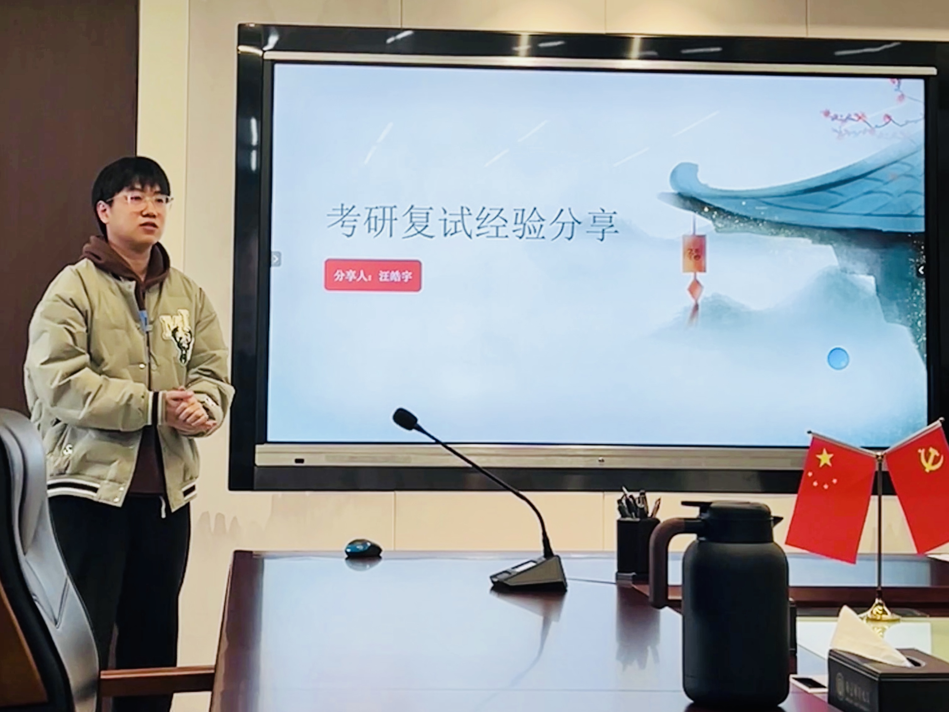 紧接着,南京审计大学研究生会宣传中心干事林洛妤和聚彩堂 研究生第二党支部书记汪皓宇分别从“笔试准备、临场态度、面试技巧”和“专业知识、时事热点、逻辑表达”六个方面为研考同学分享经验;与会的学长学姐与学弟学妹进行了交流与讨论。