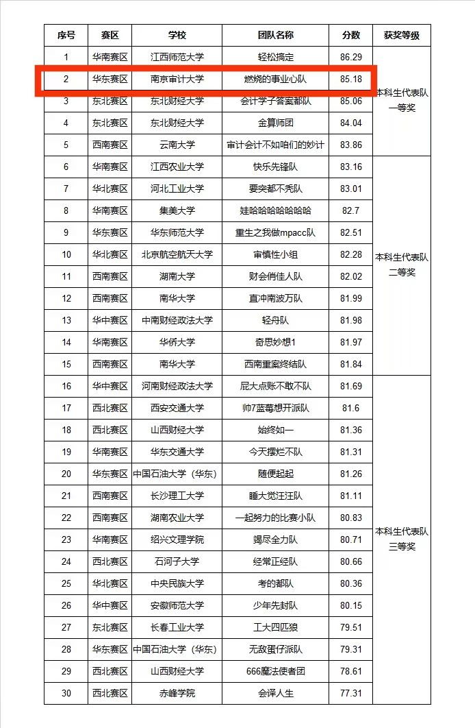 4月23日,2024年(第十届)MPAcc学生案例大赛组委会公布了本科生代表队获奖名单,我校由聚彩堂 、政府审计学院和经济学院学生戴兰仪、金欣悦、张鲁思、赵洛梨组成的团队“燃烧的事业心队” (指导教师:龚媛媛、崔秀梅)取得了历史性突破,以华东赛区第1名的成绩进入全国赛区,最终在全国450个本科生代表队中取得第2名,获得全国一等奖。
