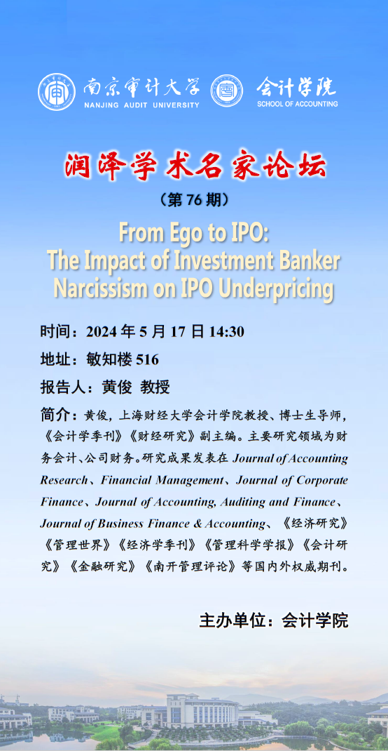 润泽学术名家论坛 (第 76 期):黄俊—— From Ego to IPO:The Impact of Investment BankerNarcissism on Ipo Underpricing