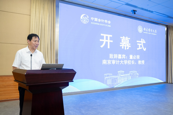 南京审计大学校长董必荣教授致辞,董必荣首先感谢中国会计学会会计教育分会对南京审计大学的信任与支持,并代表学校全体师生向与会嘉宾表示热烈欢迎。随后董必荣介绍了南京审计大学作为全国唯一一所以“审计”命名的全日制普通本科院校,在审计教育与研究方面的深厚底蕴和卓越成就。他强调,面对新时代新要求,会计理论研究与创新不仅是推动会计行业自身发展的内在动力,更是服务国家治理体系和治理能力现代化、推动高质量发展的重要支撑。本次年会围绕高质量发展与财会监督、审计监督、会计创新人才自主培养等议题展开深入研讨,旨在通过汇聚专家学者的智慧和共识,推动会计理论体系的创新与发展,以更好地服务于国家重大战略和经济社会发展大局。董必荣最后预祝本次会议取得圆满成功,并希望各位领导和专家能继续关怀和支持南京审计大学的各项事业发展。他诚挚邀请大家常来南审做客,共同为会计教育与研究事业的繁荣发展贡献力量。
