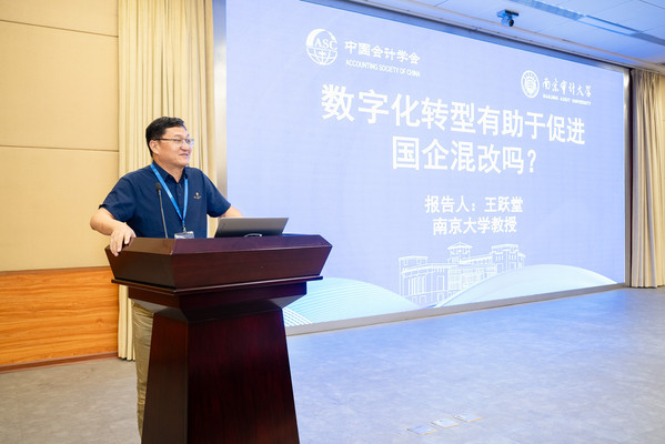 王跃堂做题为“数字化转型有助于促进国企混改吗?”的主题报告。首先从数字化转型的经济后果、国有企业混合所有制改革的影响因素等方面开展文献分析;其次,提出“国有企业数字化转型能有效促进非国有股东参股国有企业”“国有企业数字化转型对非国有投资者参股国企的促进作用在控制链条较短的国企中更加明显”等假设,并展示实证分析过程;再次,指出对于国资监管层而言,国资监管机构可以积极推动下属拟混改国企进行数字化转型,充分发挥数字化的信息作用和治理作用,有效改善国企的信息环境,降低国企内外部的信息不对称程度,调动非国有资本参股国企的积极性,扎实推进国企混改,且在不同的国企类型中,国企数字化转型对非国有投资者参股国企的影响存在异质性。