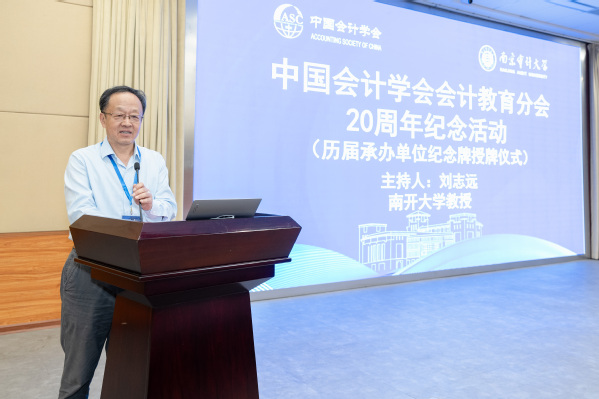 2024年是一个具有重要意义时间节点的一年,既是中国会计学会会计教育分会新一届理事会成立之年,又恰好是中国会计学会会计教育分会满20周年,为此,开幕式同时举行了20周年纪念活动。中国会计学会会计教育分会副会长、南开大学刘志远教授主持中国会计学会会计教育分会20周年纪念活动。由靳庆鲁、中国会计学会会计教育分会副会长、武汉大学王永海教授共同为2004年至2023年承办中国会计学会会计教育分会主办“中国会计学会学术年会”的承办单位授予20周年纪念牌。