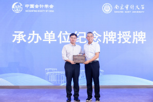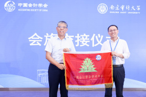 中国会计学会会计教育分会学术年会的下届承办单位代表、上海财经大学刘浩教授发言。刘浩对南京审计大学举办了这次会议表示感谢,同时也承诺明年的会议将学习今年会议的亮点并进行进一步创新。刘浩强调,中国会计教授会于1995年成立,明年学术年会将在会计教授会的发源地上海财经大学举办,对其30年走过的历程做一段回忆,并对各位来宾做出了提前一年的邀约。本届和下届承办单位的代表进行了会旗交接仪式,至此,中国会计学会会计教育分会2024年学术年会画上了圆满的句号。