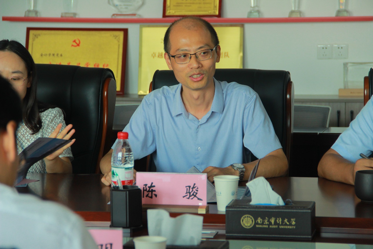 陈骏致欢迎辞,他代表学校向中信泰富特钢集团、南京钢铁集团表达一行表示热烈欢迎,并介绍了南审建校40年来的发展历程、办学特色和成果,指出学校是审计人才培养的摇篮、审计科学研究的基地、审计事业发展的智库、审计国际交流的窗口和审计文化传播的平台,并表达了对中信泰富特钢集团、南京钢铁集团长期支持学校发展的感谢和双方进一步合作的期待。