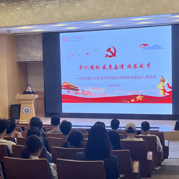 吴春梅对2024级研究生新生表示热烈欢迎。讲座开始后,她首先从牢记嘱托、感恩奋进方面,带领全体研究生一起深入学习党的二十届三中全会精神、《习近平给南京审计大学审计专业硕士国际班的留学生的回信》精神、署领导和省领导讲话重要精神。接着,从传承校训、植根铸魂方面,要求研究生践行诚信、求是、笃学、致公的校训,并对校训具体含义进行阐释。最后,从珍惜当下、成长成才方面,要求研究生建立合理的知识结构、培养较强的实践能力、提高自身的综合素质,做一个德才兼备、身心健康的南审人