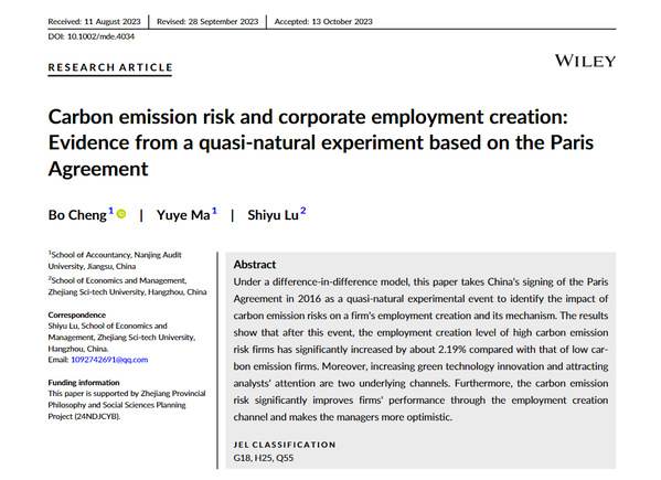 摘要:本文以2016年中国签署全球气候变化新协议《巴黎协定》为准自然实验事件,构建双重差分模型,系统地识别碳排放风险对公司就业创造的影响及其作用机制。研究结果显示,《巴黎协定》签署后高碳排放风险公司较低碳排放公司就业创造水平显著增加了约2.19%。进一步研究发现,碳排放风险通过增加绿色技术创新和吸引分析师关注两条路径影响高碳排放风险公司就业创造水平。此外,碳排放风险通过就业创造渠道显著提升公司业绩,并且使得管理层语调也更为乐观。