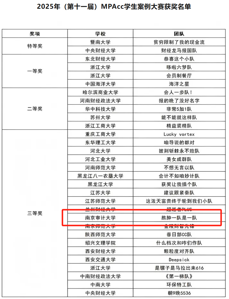 自今年3月大赛启动以来,来自全国200多所高校的3173MPAcc队伍和307支本科生队伍报名参赛。“熬肿一队是一队”经过南京审计大学校内选拔,在初赛第一阶段以不到5%的晋级率,荣获华东赛区特等奖,作为华东赛区第名进入第二阶段。