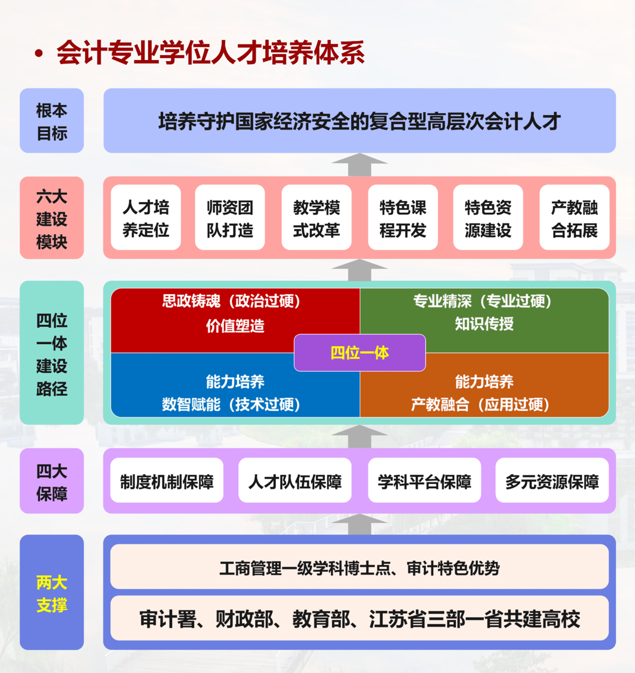 本学位点承袭南京审计大学的审计学科优势和多年来会计学科建设成果,坚持走内涵式发展道路,以“立德树人”为根本、职业需求为导向、提高质量为主线,基于我校服务于“审计+经济监督+国家治理”的学科布局,对接行业需求,深化产教融合,沿着“立德树人+数智赋能+产教融合+财会本色+审计特色”的建设路径,聚焦“财会监督与组织治理”,致力于培养德、智、体、美、劳全面发展的智能化、复合型高级财会专业人才。