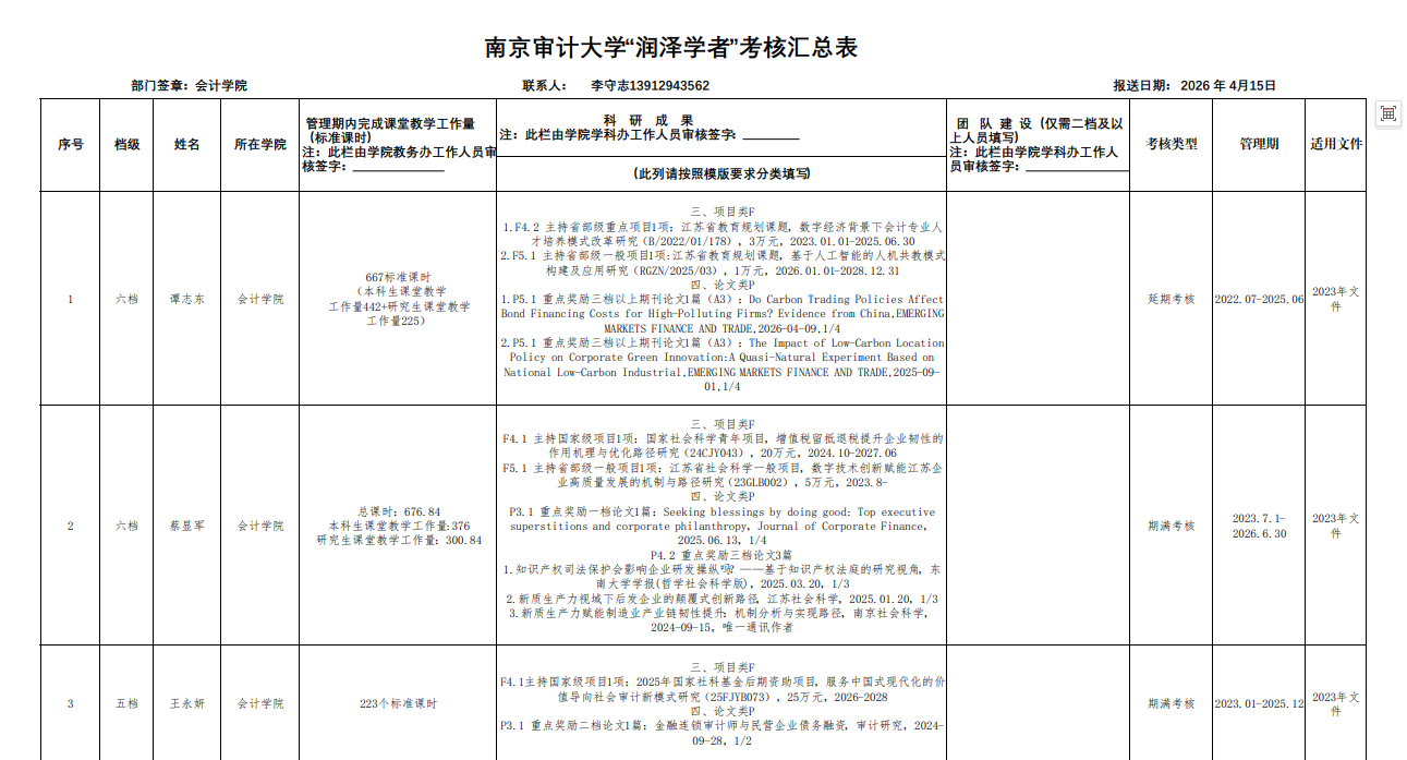 根据学校《关于做好2026 年“润泽学者支持计划”期满考核工作的通知》要求,学院严格按照考核标准与程序组织实施。工作各环节包括:公开通知、个人申报、材料审核、师德师风把关、党政联席会决议等环节,严格落实审核要求。
