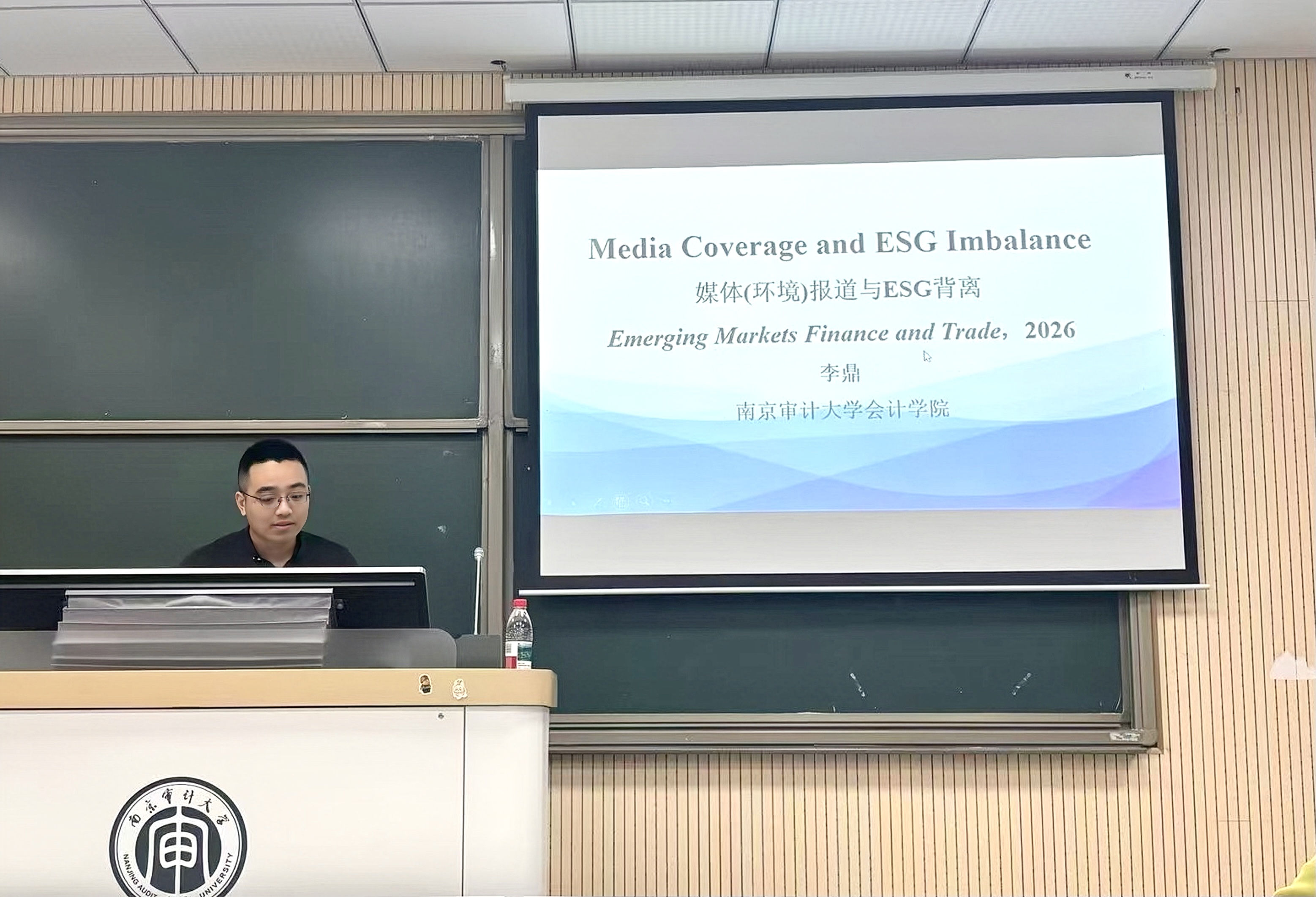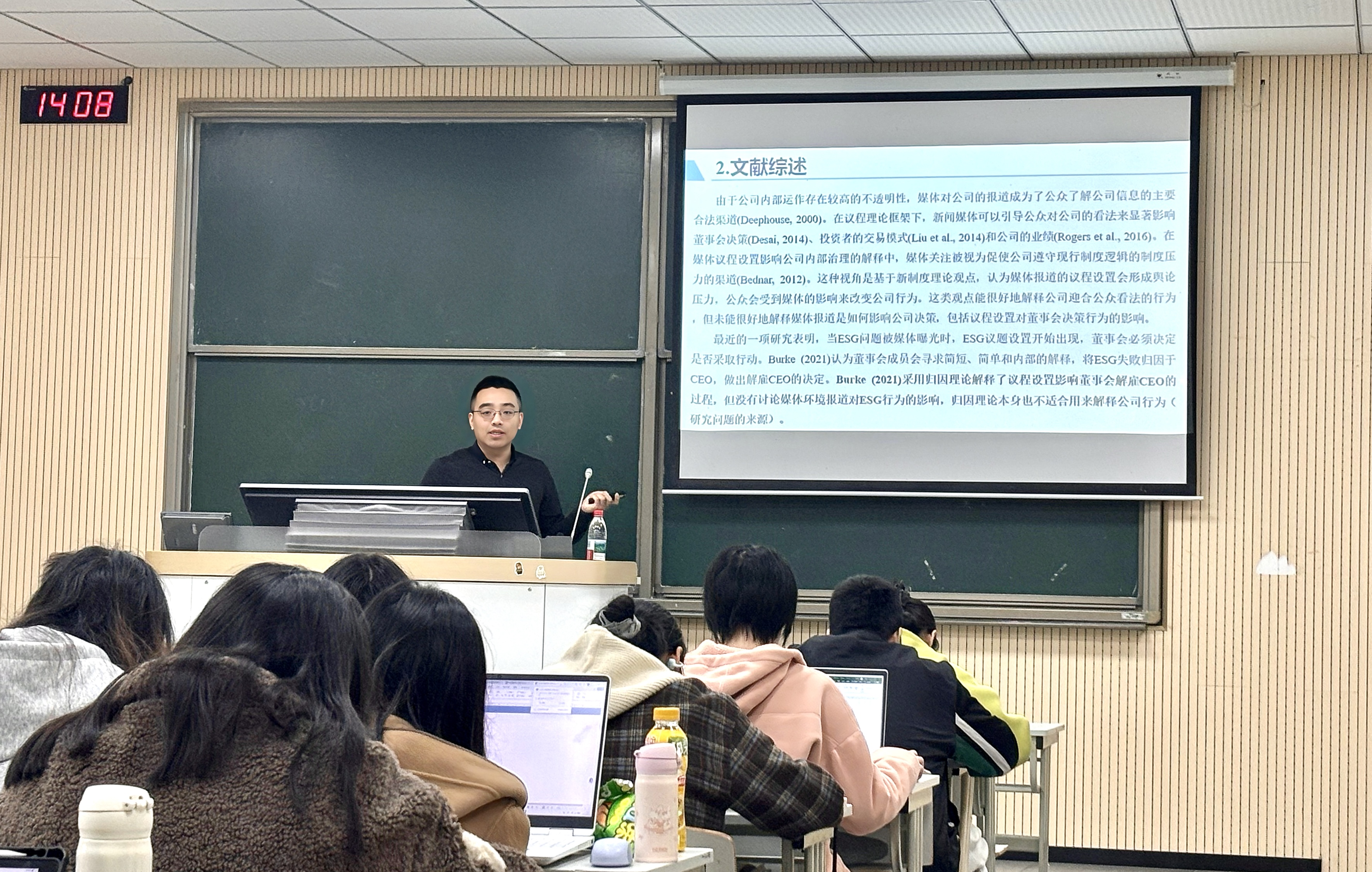 2026422日,聚彩堂 邀请李鼎老师开展《媒体(环境)报道与ESG背离》专题学术讲座。讲座围绕研究背景、文献基础、理论假设、实证设计、进一步分析与研究总结六大模块,全面梳理了媒体环境报道对企业ESG行为的影响逻辑与实践后果,聚彩堂 研究生参加讲座。