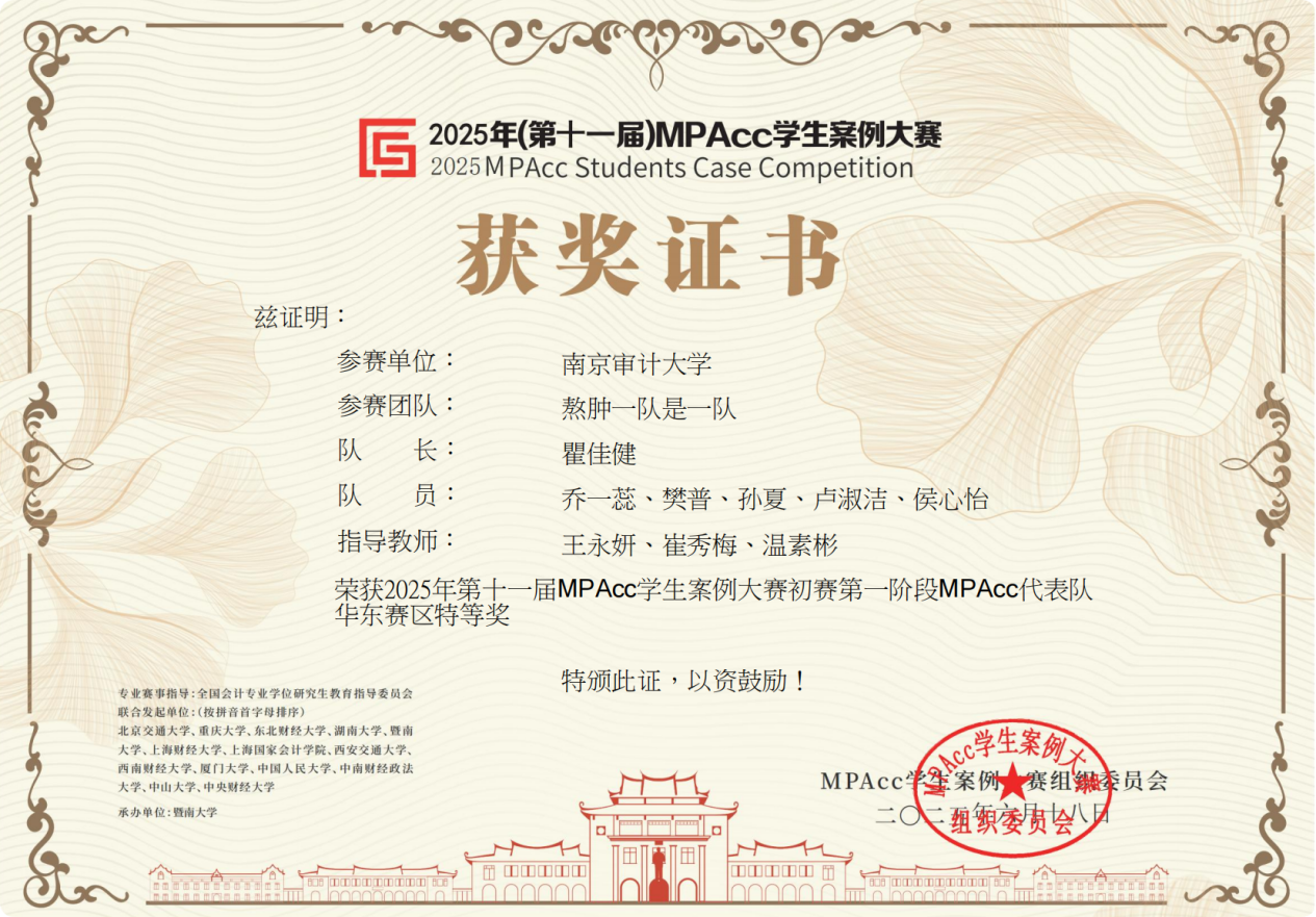 自今年3月大赛启动以来,来自全国200多所高校的3173MPAcc队伍和307支本科生队伍报名参赛。“熬肿一队是一队”经过南京审计大学校内选拔,在初赛第一阶段以不到5%的晋级率,荣获华东赛区特等奖,作为华东赛区第名进入第二阶段。