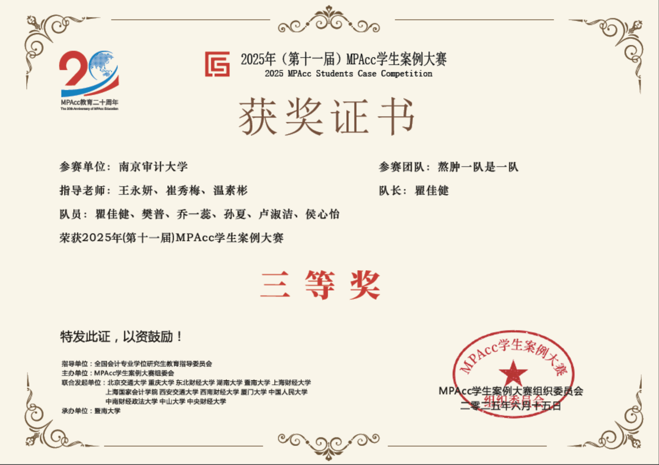 6152025年全国第十一MPAcc学生案例大赛在暨南大学举办。由王永妍、崔秀梅和温素彬三位老师指导的由2024级会计专硕研究生瞿佳健、乔一蕊、孙夏、樊普、卢淑洁、侯心怡组成的“熬肿一队是一队”凭借优异表现,经过初赛第一阶段、第二阶段,冲进全国前30,荣获全国三等奖。