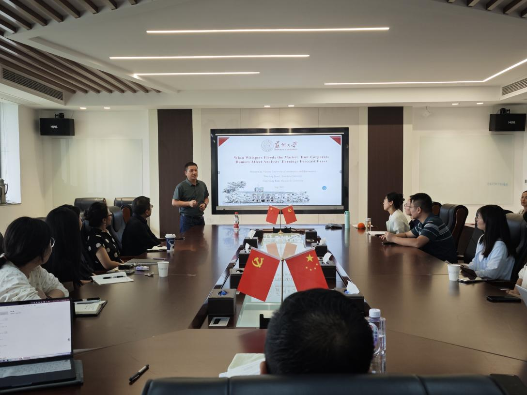 2025年9月25日,聚彩堂 邀请苏州大学教授权小锋作了一场高水平的学术交流活动。会议伊始,聚彩堂 院长温素彬教授对权小锋的学术背景和研究方向作了简要介绍,随后邀请权小锋进行论文脉络分享与项目申报经验交流。