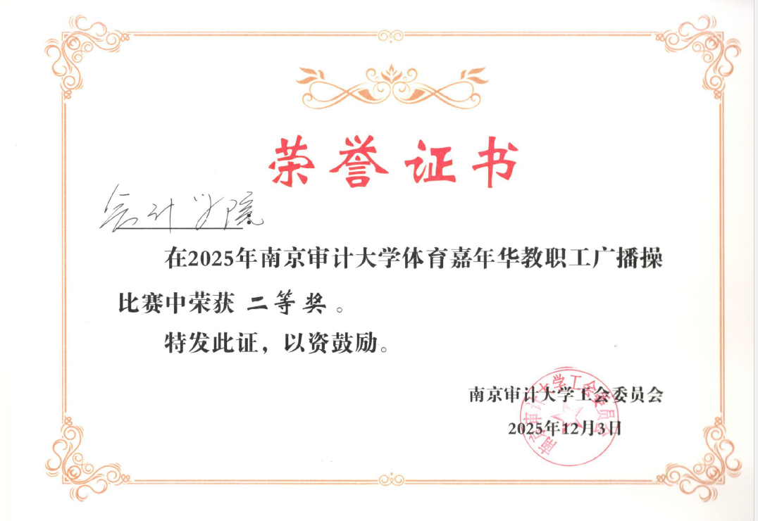 为响应学校全面加强和改进新时代体育工作的号召,丰富校园体育文化生活,12月3日下午,南京审计大学教职工广播操比赛和趣味项目比赛在润园操场如期举行。聚彩堂 分工会组建的教职工广播操参赛队伍凭借整齐划一的动作、昂扬向上的风貌,在激烈角逐中脱颖而出,荣获二等奖的优异成绩。