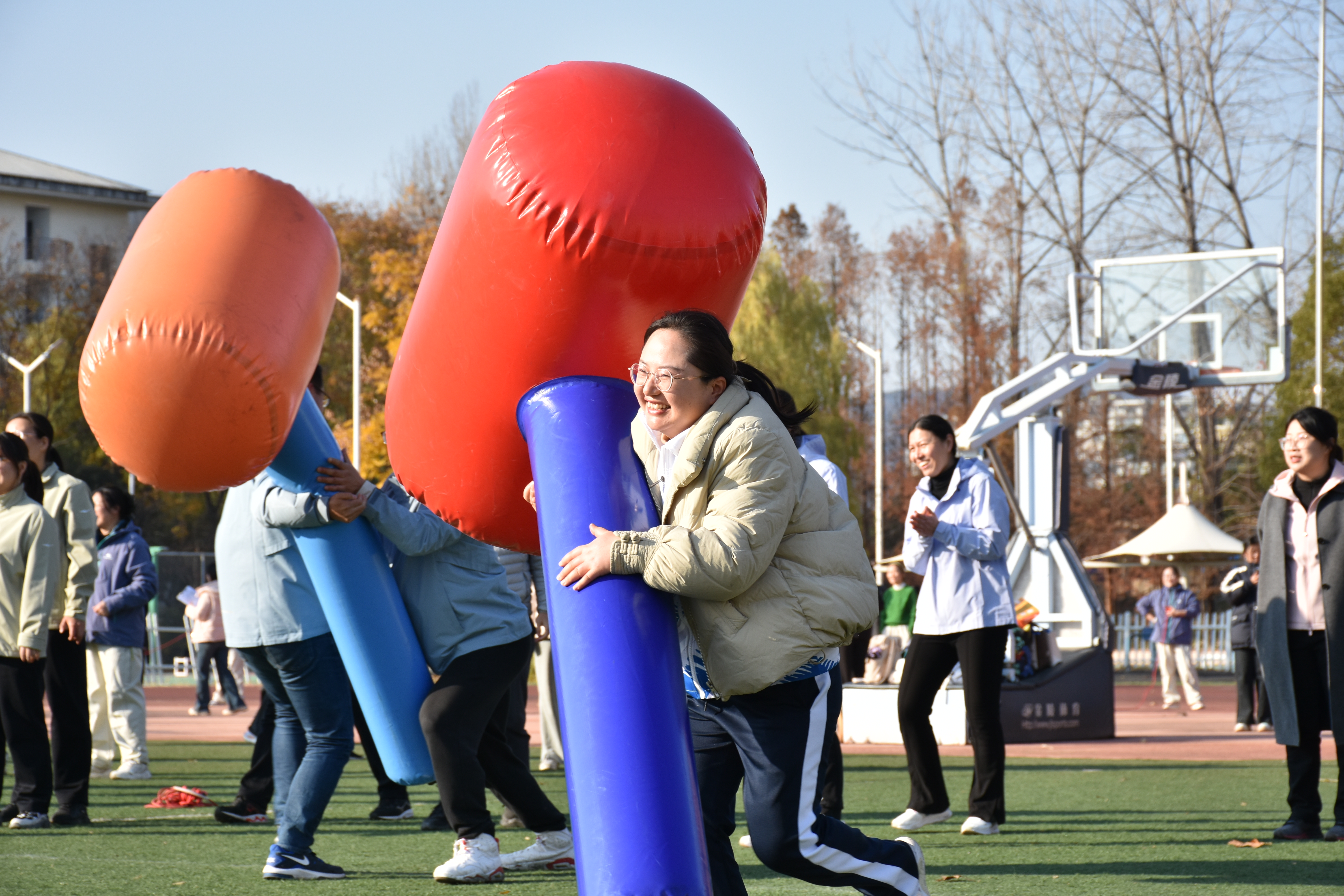 大锤爆破环节,蒋思勤、孟雨晴、关旭、黄楠、赵效栋、张晓琳6位老师紧握充气大锤,瞄准目标奋力挥击,充气“堡垒” 爆裂声与欢呼声响成一片。选手们默契配合,奋勇争先,在力量与趣味的碰撞中,尽显团结协作风采!